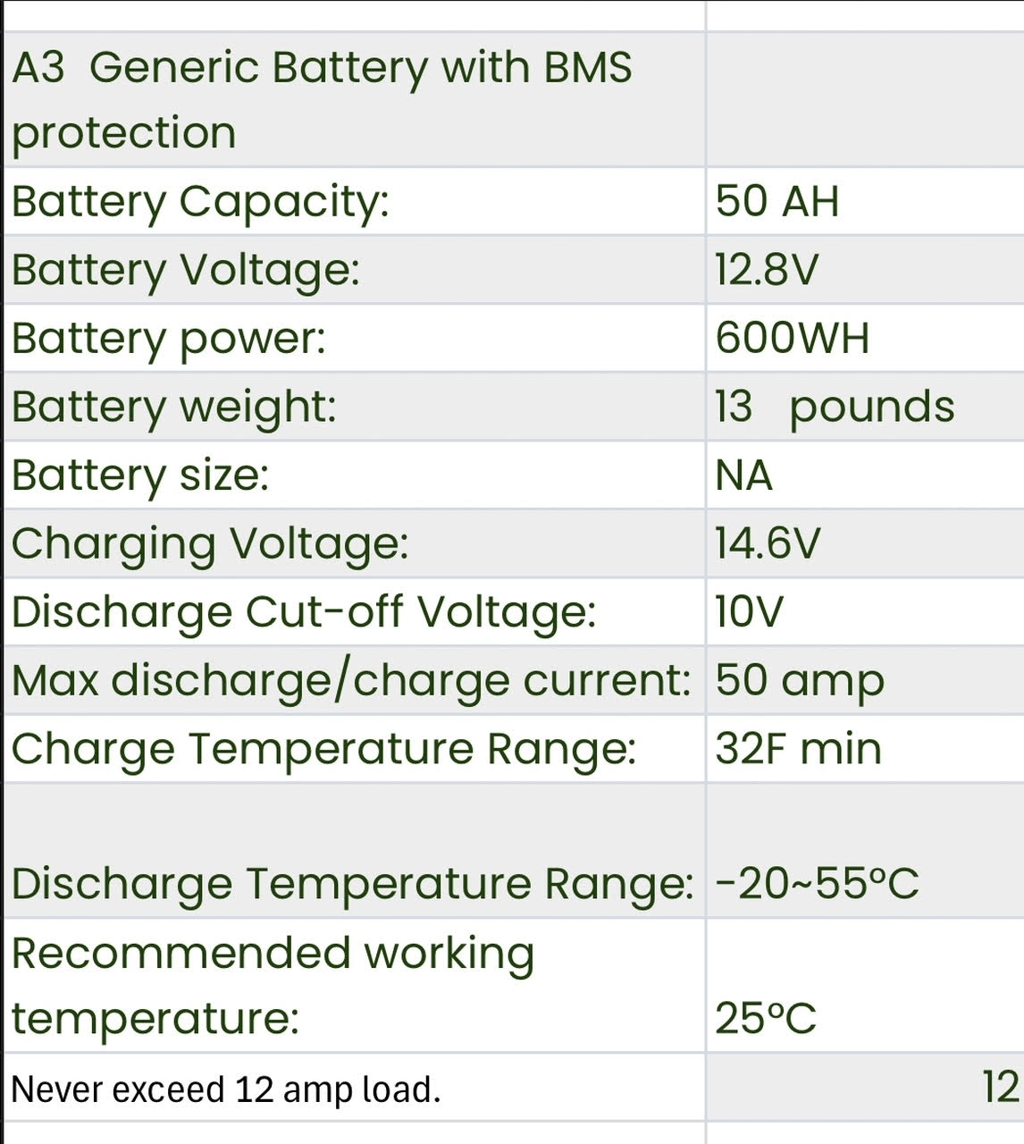 •  3A: 50AH  LIFEPO4– Solid mid-size for extended nights